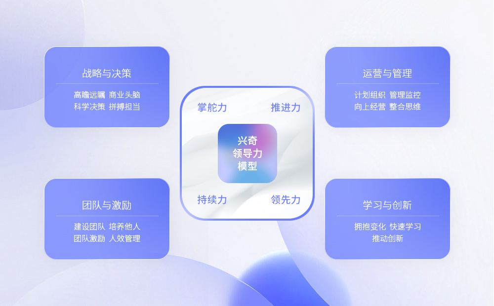 興奇集團(tuán)精粹四維領(lǐng)導(dǎo)力模型,將掌舵力、推進(jìn)力、持續(xù)力、創(chuàng)造力作為人才梯隊(duì)領(lǐng)導(dǎo)力發(fā)展的標(biāo)桿藍(lán)本,以領(lǐng)導(dǎo)力建設(shè)賦能企業(yè)內(nèi)核競爭力保鮮和組織韌性增長。